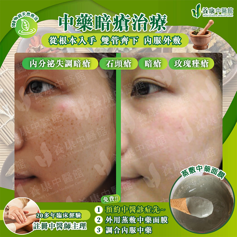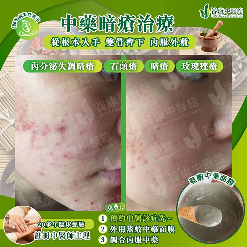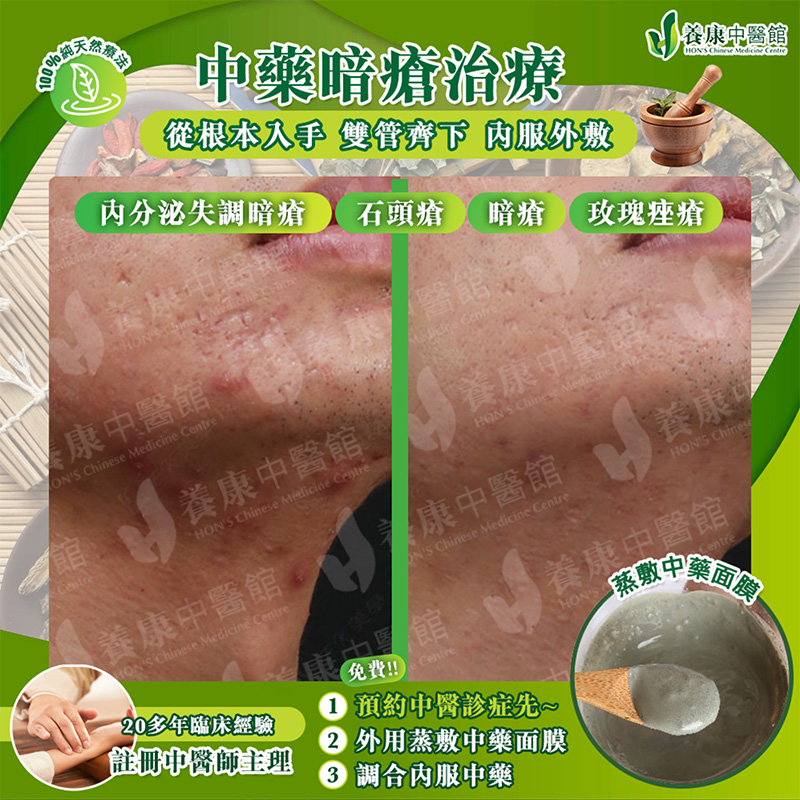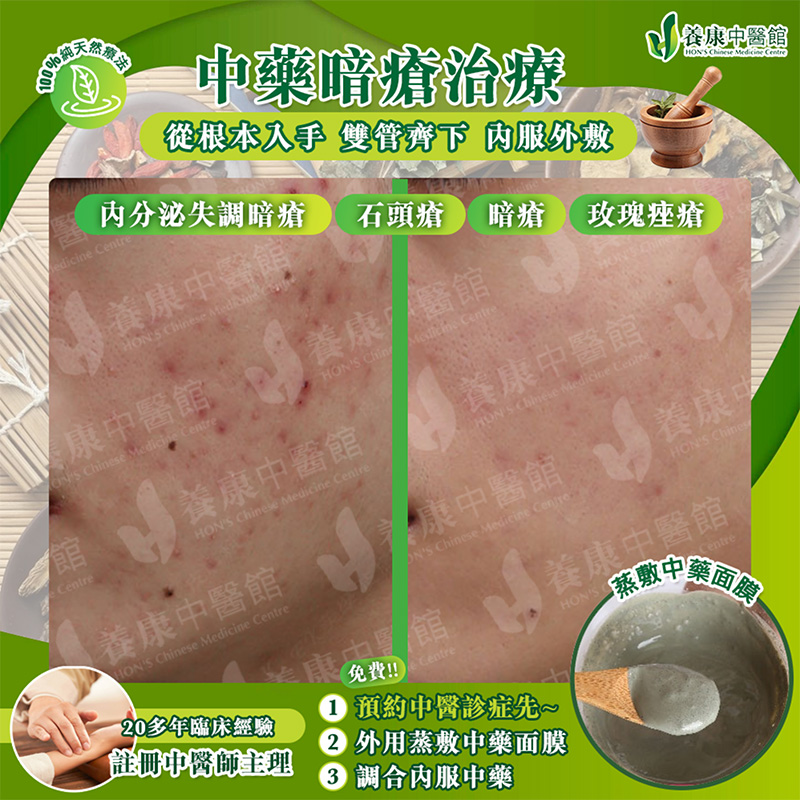 使用中藥暗瘡治療,包括內服中藥及外用蒸敷中藥面膜,按到診者的實際情況而定。外服中藥能顯著並快速地控制暗瘡在皮膚上滋生;內服中藥則能使人體的陰陽平衡得以恢復,清理體內毒素,從根本地解決暗瘡問題。